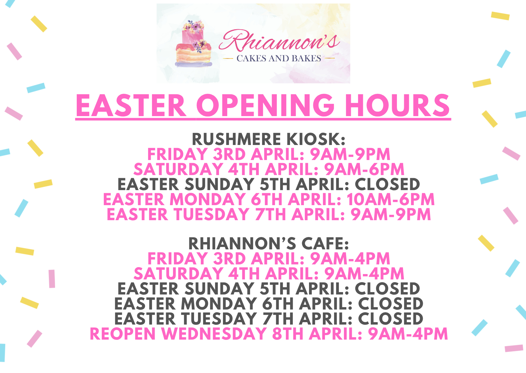 for all occasions with a bakery kiosk based in Rushmere, Craigavon and Rhiannon’s Cafe in Portadown for all your homemade treats!